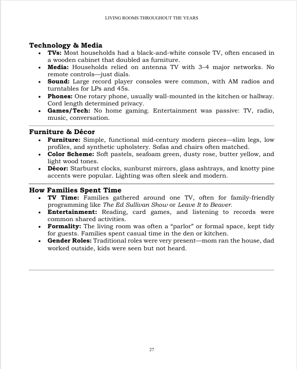Each entry consists of a graphic image of the living room of the day. Then it lists details about the room, the furniture & decor, and how the families of the day spent their time together. And this is followed by a story told by one of the family members about what life was like at that time.