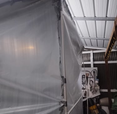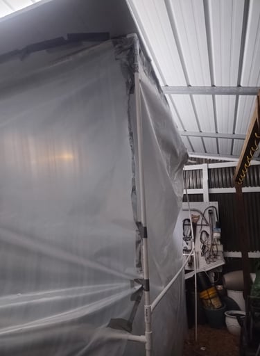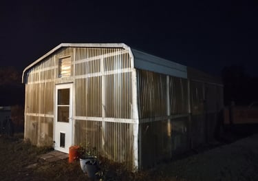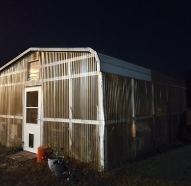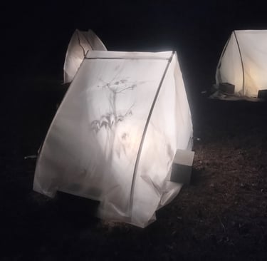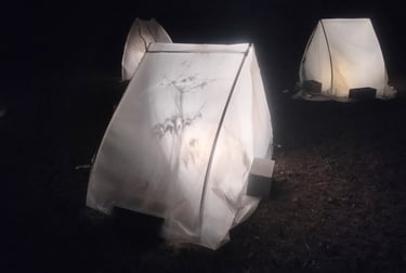 Our citrus trees are still young, not yet hardened enough to take South Carolina cold snaps on their own. So this winter we built temporary shelters — simple PVC frames secured with rebar stakes and wrapped in vis queen to hold warmth while still letting in sunlight. On the coldest nights, low-wattage chick heaters come on and take the edge off the freeze.