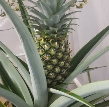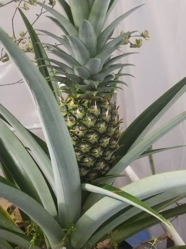 The delicate plants have moved into the greenhouse, where we built a smaller, insulated enclosure inside the larger structure. That little pocket stays 10–15 degrees warmer — warm enough for a pineapple to keep developing in the dead of winter.